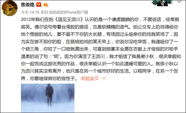 女主角@焦俊艳 则撰写长文,回忆了与高以翔合作时的点点滴滴,称其“温暖可爱”,并动情写下:“以翔同学,在另一个世界,你要继续做你的慢性子”。