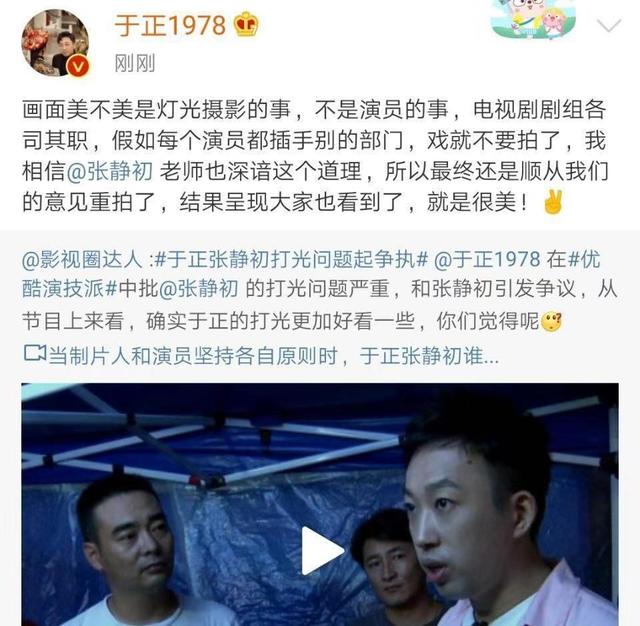 于正也是不怕事的人,他直言没有演技的女演员才靠脸吃饭,转而又说张静初演技这么好不需要,逼得张静初只能重新拍自己的那场戏。