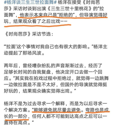 而谈到这件事的后续影响,杨洋并没有提到自己的演技因此被质疑的事情,只是认为,这件事更像是一个弯路,“弯路也是成长的一部分”。