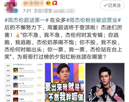 首先说一说蔡徐坤,今年七月份,因为蔡徐坤粉丝的不当言论,导致一直很佛系的周杰伦粉丝团结一致开始奋起,和蔡徐坤粉丝之间来了一场某社交平台榜单排名的battle。