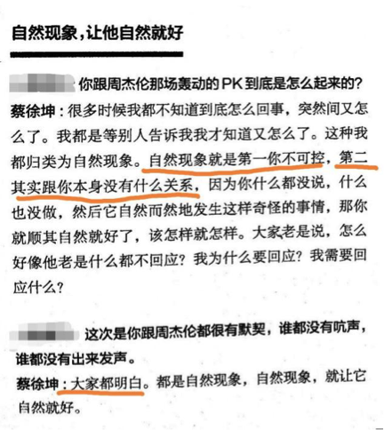 蔡徐坤将粉丝之间的战争解释为一种“自然战争”,自然战争无法控制,和明星本人也没有太大的关系。蔡徐坤认为,一切顺其自然就好。