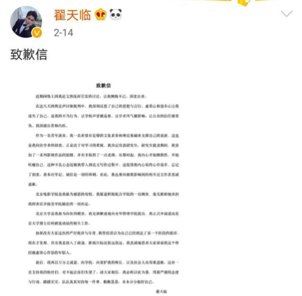 因此出事后还不到一星期,翟天临就在自己的社交账号上晒出了致歉信。