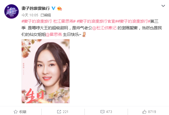 同时,《妻子的浪漫旅行》第三季官宣,霍思燕和杜江成为首对确认加盟的夫妻,在节目组曝光的宣传片里,杜江骑着自行车载着妻子霍思燕,画面浪漫而唯美,令人羡慕不已。