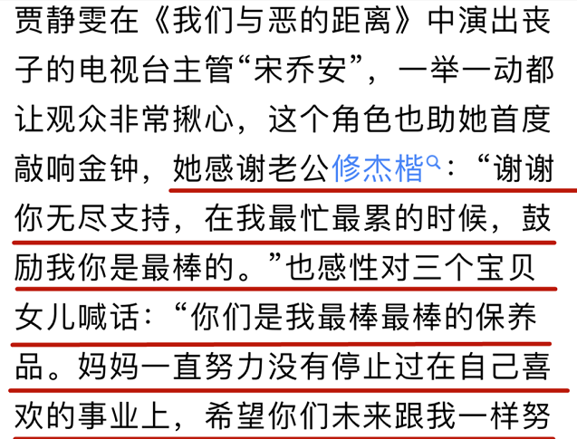 在颁奖舞台上,贾静雯难掩激动之情,感谢了自己的丈夫与孩子们。她感谢修杰楷在自己最忙的时候给予支持,也感谢三个可爱的孩子,在贾静雯看来,孩子们才是她今生最好的作品。