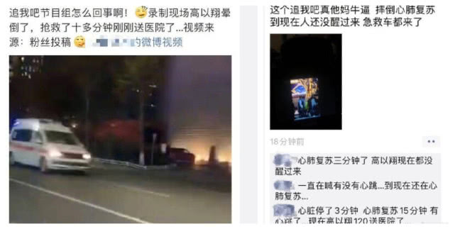 就在今天凌晨,有网友爆料称著名影星高以翔在录制节目《追我吧》时晕倒,现场情况也是非常的危险,据投稿的拍摄视频的网友称,心脏都停了有3分钟左右,经过15分钟的心肺复苏才有了心跳,现在已经送往医院抢救了