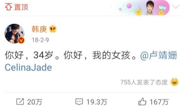 几个月后,韩庚在微博上大方公布恋情,认爱卢靖姗,甚至此后一直将这条微博置顶。从相识到公开恋情,短短几个月的时间韩庚就忍不住想要和大家分享遇到卢靖姗的喜悦,可见卢靖姗对他而言有多重要。