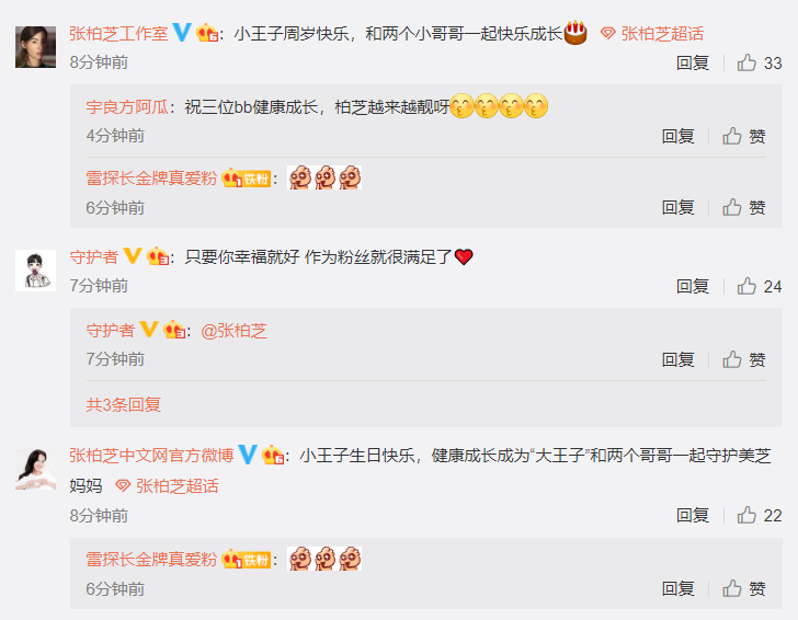 当然啦,Marcus迎来一周岁的生日,不仅仅张柏芝本人,其中包括不少粉丝和网友,也在第一时间为其送上了生日祝福,她们也表示:“小王子周岁快乐,和两个小哥哥一起快乐成长”。