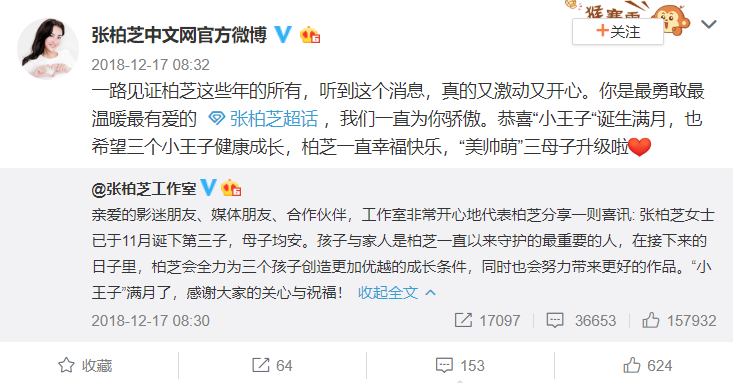 据悉,在去年11月份时港媒曾率先爆料张柏芝秘密产子,不过,后续张母被拍到前往医院被问及是否去探望生产的女儿时,张母却只称只是去看病,让许多粉丝无比失望,还好,在时间过去一个月后,2018年12月17日,张柏芝工作室终于发文承认了张柏芝生子的喜讯,并表示孩子已经平安迎来满月。