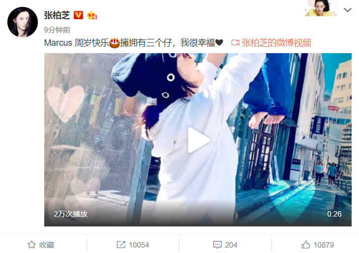 11月18日夜晚,张柏芝在微博上更新视频动态,她也配文表示:“Marcus 周岁快乐,拥有三个仔,我很幸福”