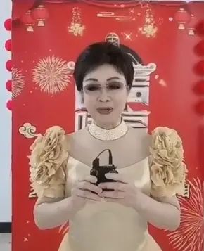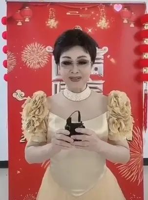 这个是李谷一她录制视频的时候亮相,穿的是这样的一条金色的礼服,非常的亮眼的。这件礼服还是挺好看的,旁边还有那种花朵的设计就很符合这种喜庆的节日呢,显得特别的有个性。