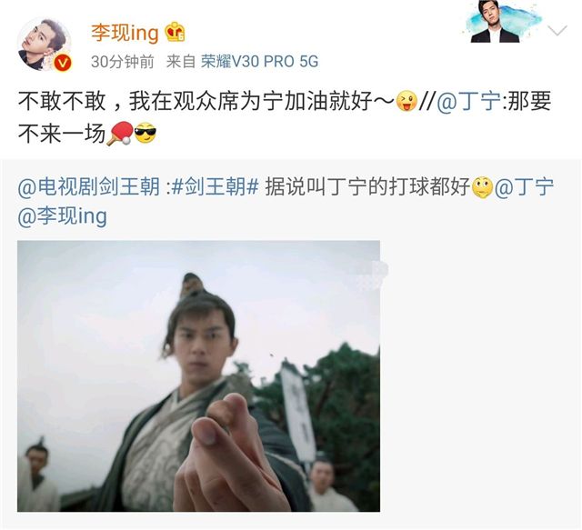 北京时间12月29日,电视剧剑王朝的官方社交平台发文调侃:“据说叫丁宁的打球都好”,引来丁宁的在线约球:“那要不来一场”。随后,帅气男星李现秒怂求饶:“不敢不敢,我在观众席为宁加油就好~”