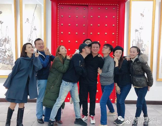 三张照片中,有两张是朱军和央视同事们的合影,其中一张大合影,朱军站在中间,满脸笑容,小尼还对朱军大胆献吻。