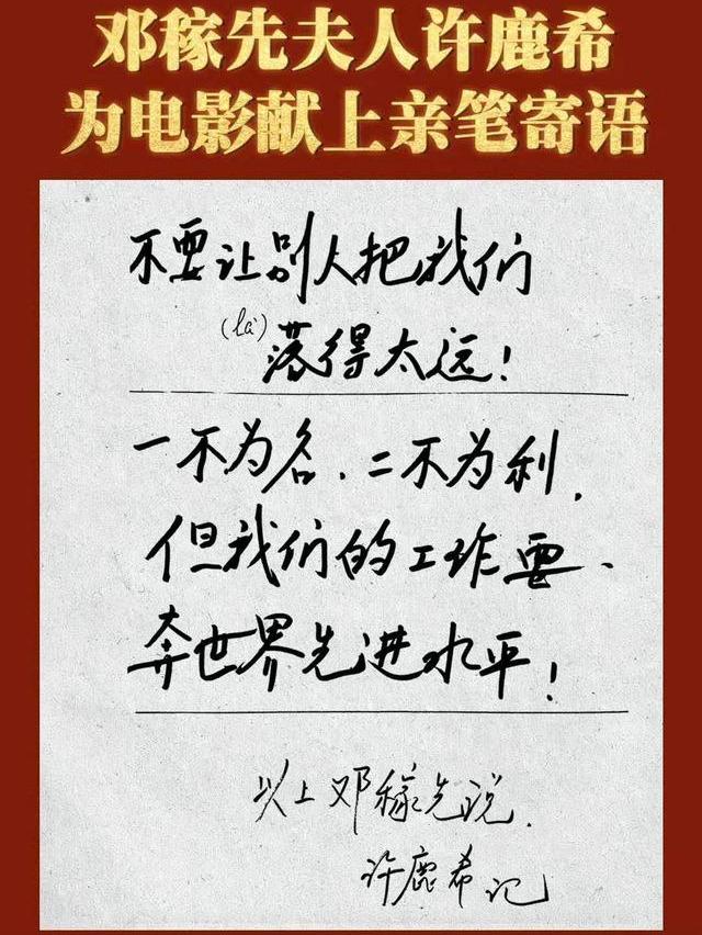 新工作安排就绪后,向来不爱照相的邓稼先和夫人许鹿希以及4岁的女儿,2岁的儿子照了一张全家福,此后这张全家福被邓稼先一直保存在钱包的夹层里。离别的前一晚,邓稼先和许鹿希彻夜未眠,邓稼先看了看家中熟睡的孩子,略带歉意对妻子说“希希,以后这个家就靠你了,我陪不了你和孩子们了,我的生命献给未来的工作了,这件事情做成了我一生无悔,哪怕为它去死也值得!”许鹿希问道“你要去哪里?可以写信联络吗?”邓稼先回答“不能说,更加不能联络。