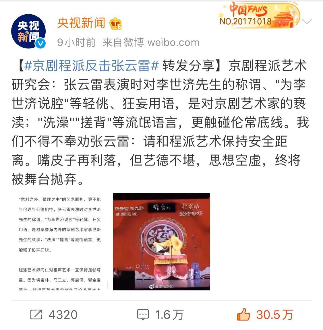 11月27日,央视新闻的官方微博,也转发分享了京剧程派艺术研究会对张云雷的反驳和批判。