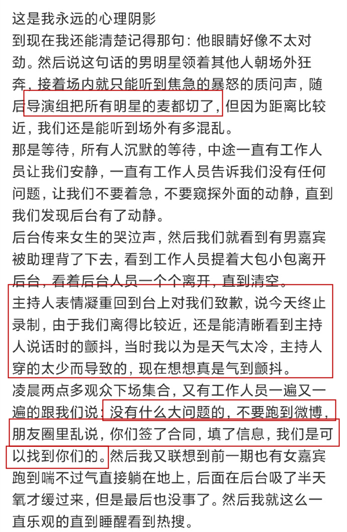 虽然该网友的爆料的许多内容都算是第一次听说,但无独有偶的是,在另一位网友的爆料中,也明确提到了主持人华少在后续哽咽表示停录,以及节目组统筹方面“警告”现场观众,不要跑到微博,朋友圈里乱说等,而两位网友的爆料,离奇到几乎连文字都如出一辙。