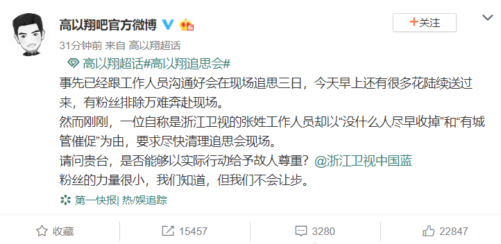 当然,在此之前我们需要得知一个刚发生不久的消息,11月29日上午,高以翔吧官方微博发文,称本已经事先与工作人员沟通了要在现场追思三日,更有粉丝排除万难奔赴现场,然而,在此时却有一位自称是浙江卫视工作人员的人,以“没什么人尽早收掉”、“城管催促”为由,要求尽快清理追思会现场。