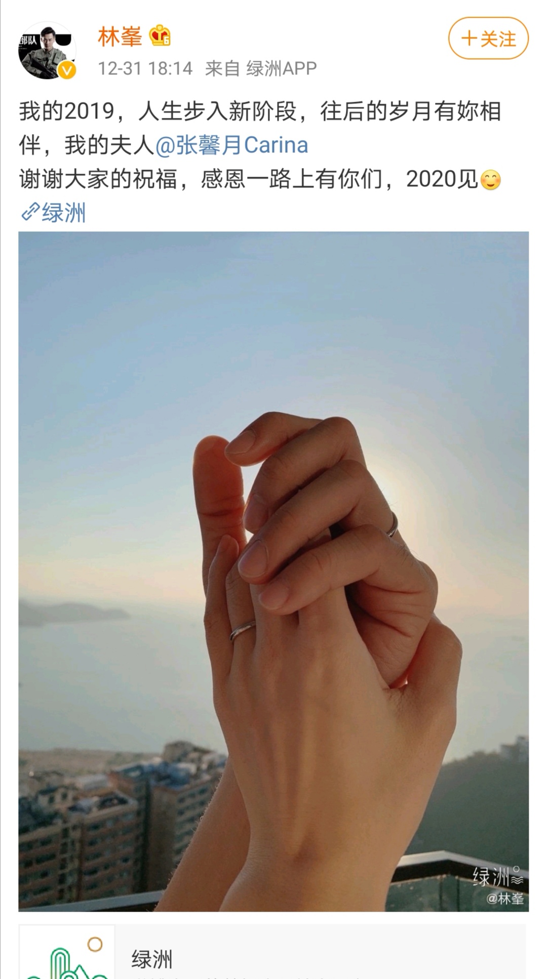 31日,林峯在微博上发布一张牵手图,并配文“我的2019,人生步入新阶段,往后的岁月有你相伴,我的夫人@张馨月。谢谢大家的祝福,感恩一路上有你们,2020见。”