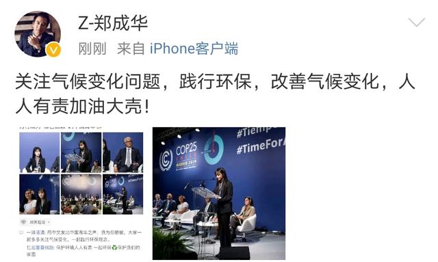 12月10日,郑爽出席第二十五届联合国气候变化大会并发言。如今爽妹子演艺事业蒸蒸日上,万万没想到能够发展到国际范的地步了。