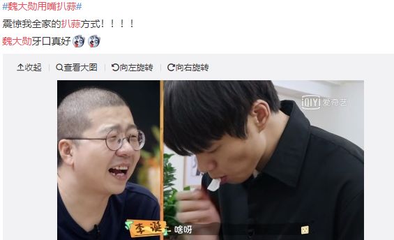所以尝到甜头的他现在可谓是在这种“逗比式”的路上一去不复返,各大节目组邀请他的时候也会跟他提出一些“搞笑”的要求。为了这种幽默搞笑的人设,魏大勋难免有时候也会做的过了一些,就比如今天“用嘴扒蒜”的这个行为,说白了,现实中的他是绝对不可能这样做的,只是为了配合“剧本”所以才故意用这种夸张的做法罢了~