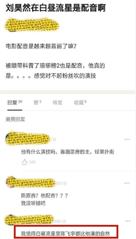 所以等到了拍完戏、上映宣传时期,陈导更偏心自己的儿子的一些作为也都是团队跟剧组商议好的结果!不论是拍摄的宣传海报、陈飞宇占C位,还是如今影片上映后、那一小撮对刘昊然演技的质疑,都是没办法避免的事儿~毕竟两个人的单元短片“白昼流星”,这种“双男主”甚至“三男主”的阵容,碰上了如今正是非常想红、想上位的陈飞宇,难免是要出现一些“比较”的话题的。所以,这不就有了一些网友质疑“刘昊然用配音,陈飞宇用原音”的话题?甚至还有“网友”直接提出了“陈飞宇在戏里面的表现比刘昊然的号”这类说法了么?