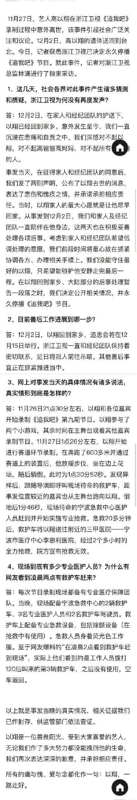 台湾艺人高以翔在录制综艺不幸猝死后,节目安全问题引发了网友广泛关注,节目组及背后的浙江卫视一时间被推上了风口浪尖。12月6日,高以翔的灵堂对外开放,数百名粉丝到场缅怀悼念,而浙江卫视的高层也有到场追悼,不过到场后的举动却令人有些寒心。