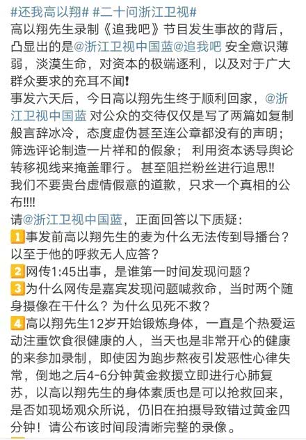 希望浙江卫视能够正视网友的呼声,给所有人一个合理明确的交代,而不是一份没有证据的澄清。网络上传言四起,相信浙江卫视也不想要看到自己这样一个省级大台一直背负这样的名声,不如实实在在地给这件事做一个了结。在天上的高以翔一定也希望自己心爱的粉丝和家人们能够知道事情的真相,在一个9分钟的短暂追悼面前,大家更希望看到那黄金四分钟发生了什么。