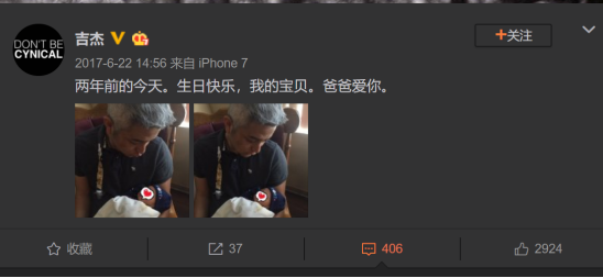 照片中吉杰抱着一个小婴儿,写道:两年前的今天生日快乐。从这条微博可以看出,他2015年就当爸了。消息来的如此突然,网友们都懵了。大家纷纷在微博下面留言震惊了,想不到系列。