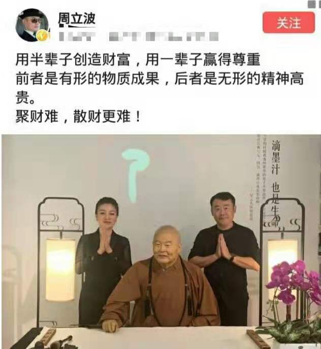 10月8日,周立波在个人账号上分享了一张和妻子拜访大师的照片,还配文:聚财难,散财更难!照片中周立波和妻子都身穿一身黑衣,双手合十分别站在大师的左右两侧。
