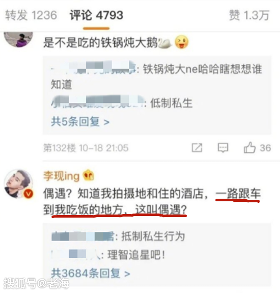 其实不光天王会遇到这样的事,如今很多明星似乎都在对私生饭很反感,这主要也是因为这些人为了展现自己与偶像的那种零距离,会做出一些伤害偶像的事。18日晚,有网友晒出了一段称是偶遇李现的视频,但是随后李现在评论区回复道:“偶遇?知道我拍摄地和住的酒店,一路跟车到我吃饭的地方,这叫偶遇?”