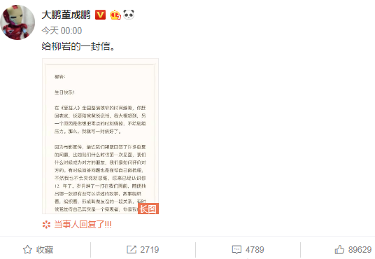 在这封公开信中,大鹏还专门谈到了一件往事,柳岩曾向其哭诉了两个小时,至于为什么哭大鹏没有讲,但很多网友都已经知道了事情的原委,因为这个时间段恰好曝出了包贝尔婚礼闹剧风波。
