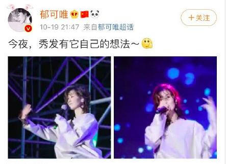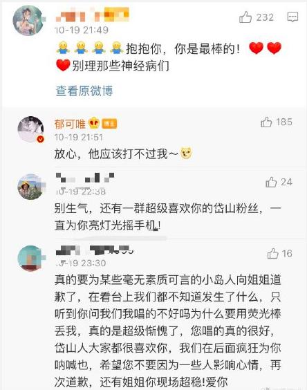 2019年10月19日郁可唯演唱会唱歌途中,突然遭到现场人士仍荧光棒,一秒钟纳闷后继续高质量演唱,郁可唯发博连提都没有提此事,该人士恶趣行为吸引关注大失败,在网友关心贴下回应网友——“放心,他应该打不过我”!