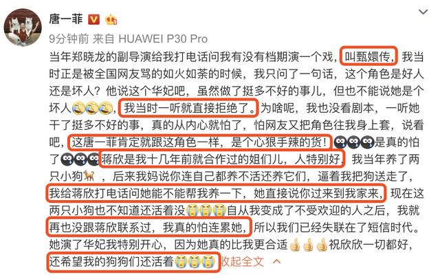 2020年1月1日,唐一菲还分享了一件旧事,称自己当年被骂得最惨的时候,却接到电话被问有没有档期拍《甄嬛传》里的华妃,唐一菲一听就拒绝了,因为华妃在剧中做过挺多不好的事情,她担心观众入戏太深,自己会被骂得更惨,说她本色演出。