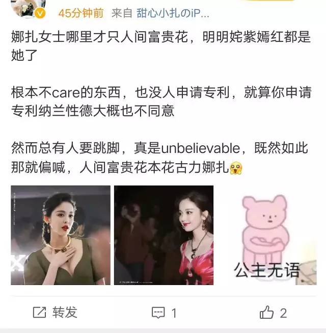 然后,就因为“人间富贵花”这五个字,古力娜扎和迪丽热巴的粉丝直接开撕了,一个说是人间富贵花现在门槛变低了,奉劝另一方不要当复读机