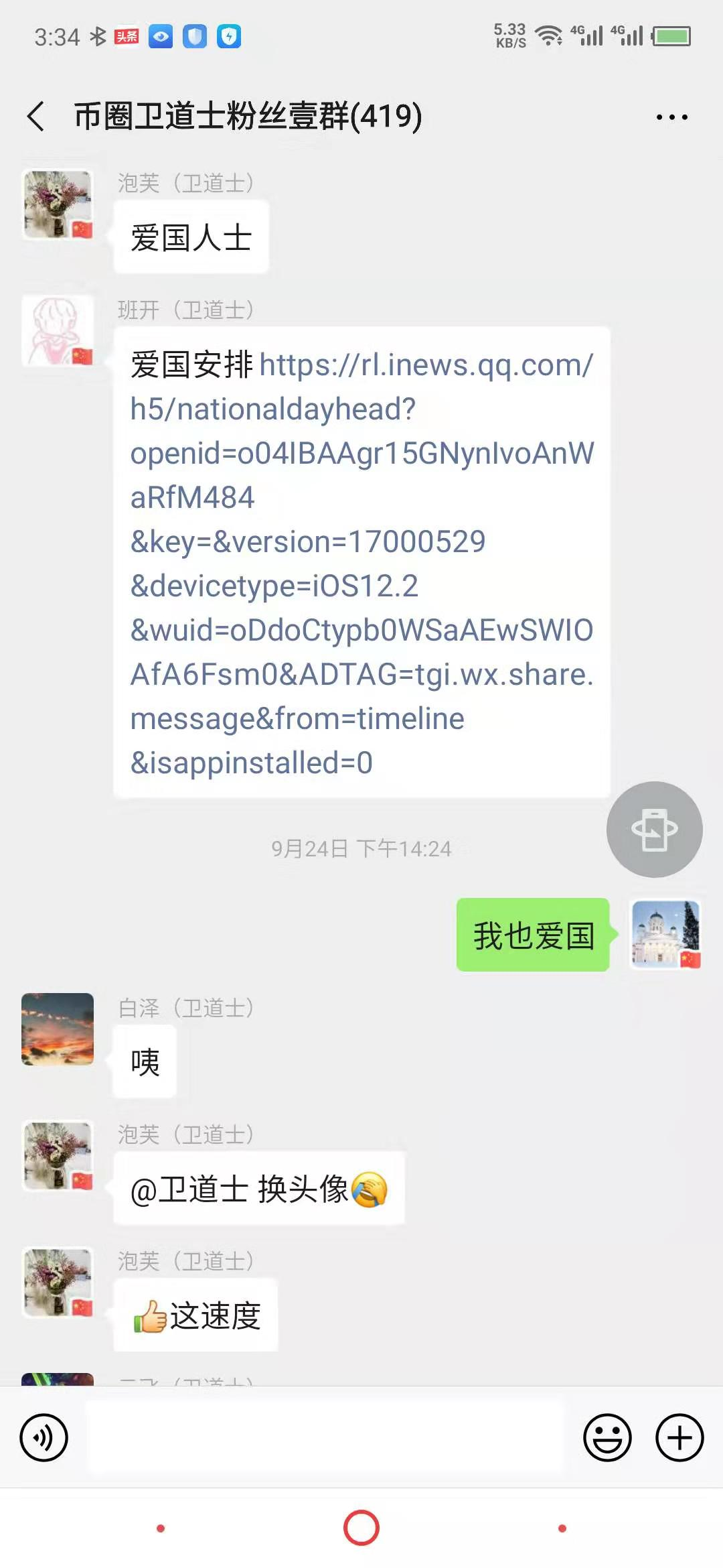 是在9月24日14点24分更换的头像,当时是有人发一个链接到群里,道士点击然后看到可以换小国旗的头像,于是道士换上了添加小国旗的头像并且还在群里发了一句:我也爱国。