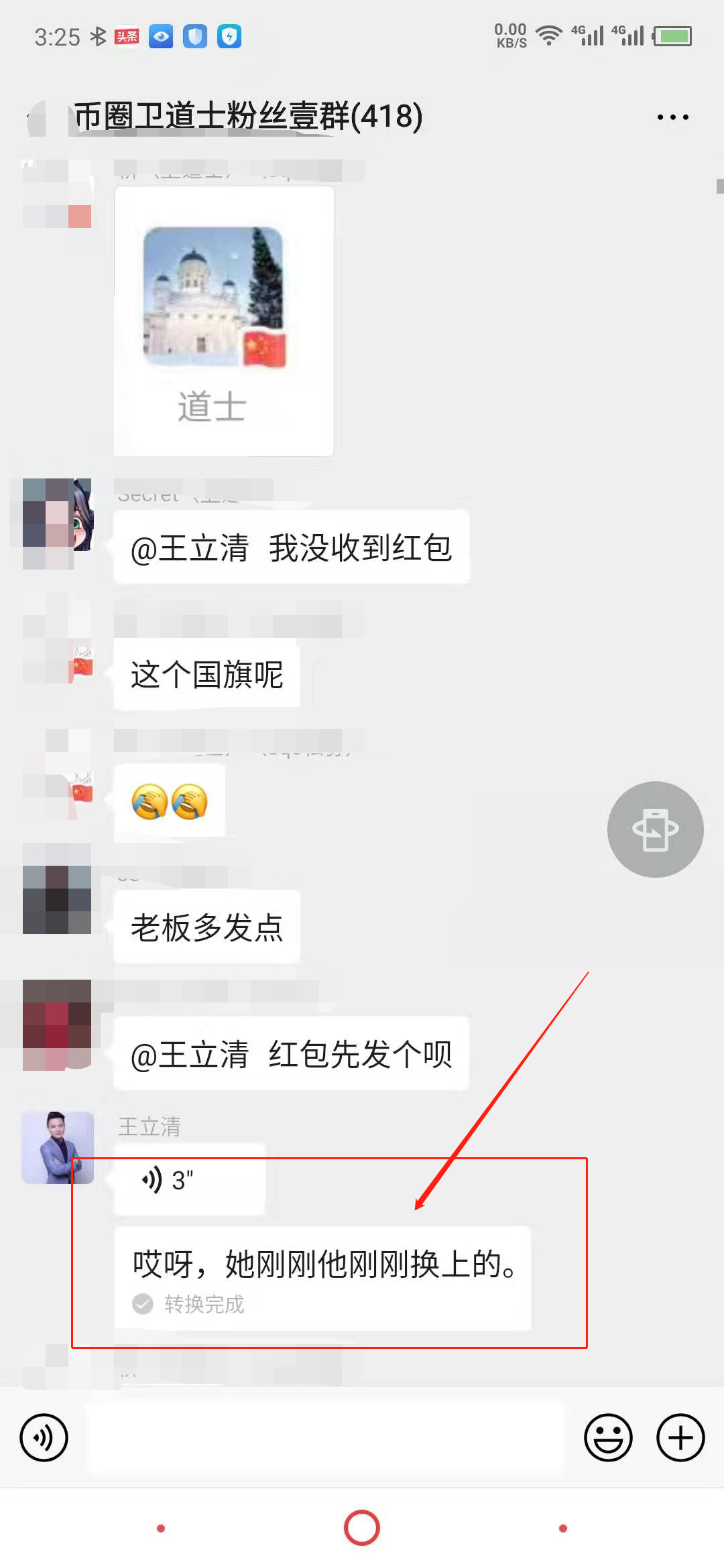 道士已经把那张敲诈的截图产生的疑问抛给了王立清,并且在400人的微信群,群成员针对他发的“敲诈截图”没有小国旗的问题,叫他做解释的时候。