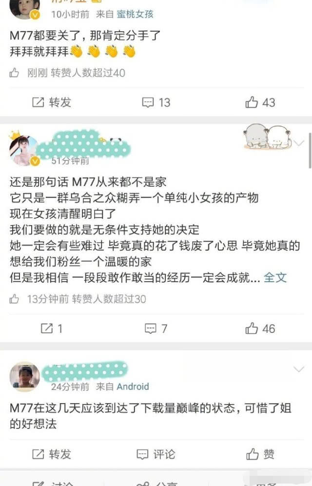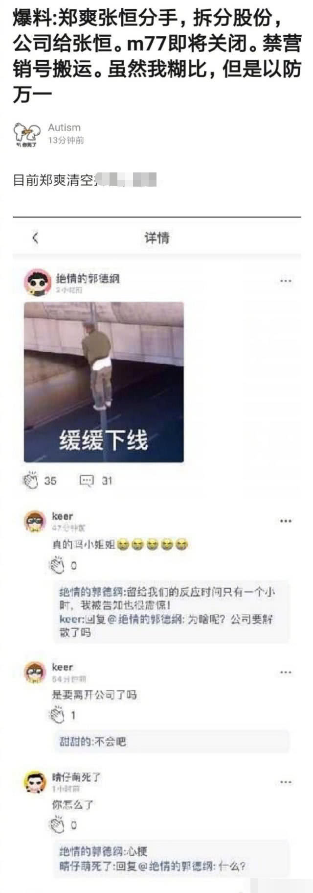 11月21日,有网友爆料郑爽和张恒已经分手,郑爽目前在拆分公司股份,决定把公司留给张恒,而公司旗下运营的粉丝平台m77也即将关闭。同时还贴出了一段粉丝之间的互动评论加以佐证,评论里某粉丝发了一张“缓缓下线”的表情包,让郑爽的粉丝们看的不明所以,其后该粉丝解释大致意思是平台即将关闭,而让粉丝们缓冲的时间也是极少。