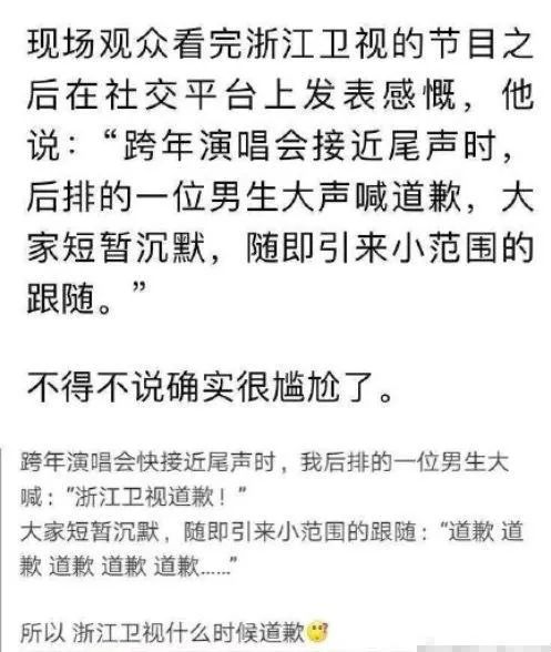 再说了,就算是还有小一部分的观众到了现场参与直播录制。这些观众也不是去捧场的,反倒是在跨年演唱会接近尾声时,有一名观众大喊“道歉”,随即引发了小范围的跟喊。