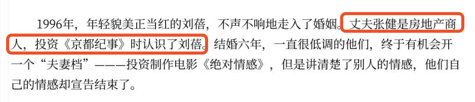 不过翻看刘蓓2008年接受采访的资料发现,她称自己的前夫是房地产商人,后来投资电影两人才相识结婚,确实能表明张健和刘蓓二人间的夫妻关系。