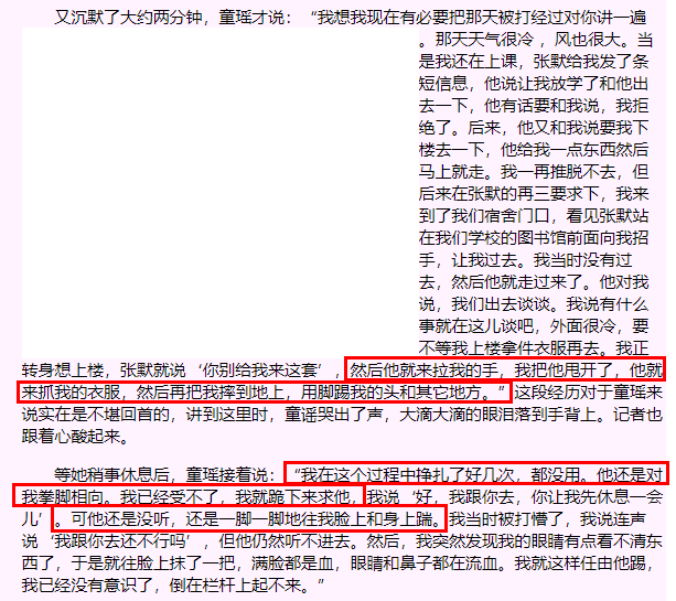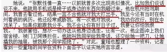 除此以外,童瑶还指出这种情况出现过很多次,张默经常对他大打出手。