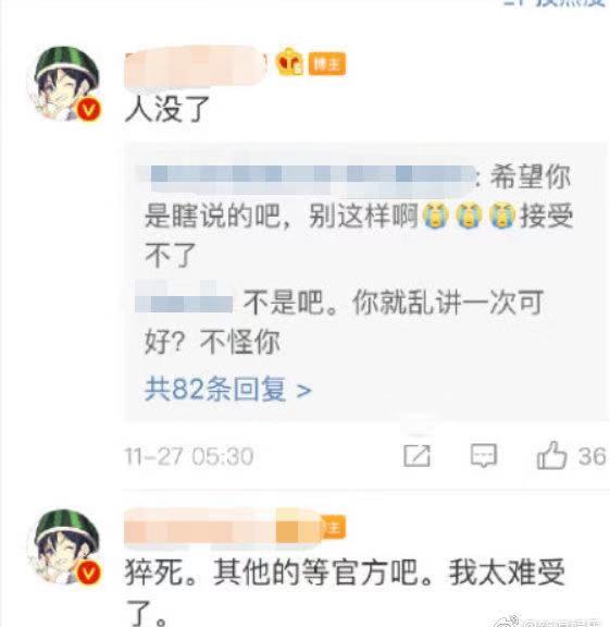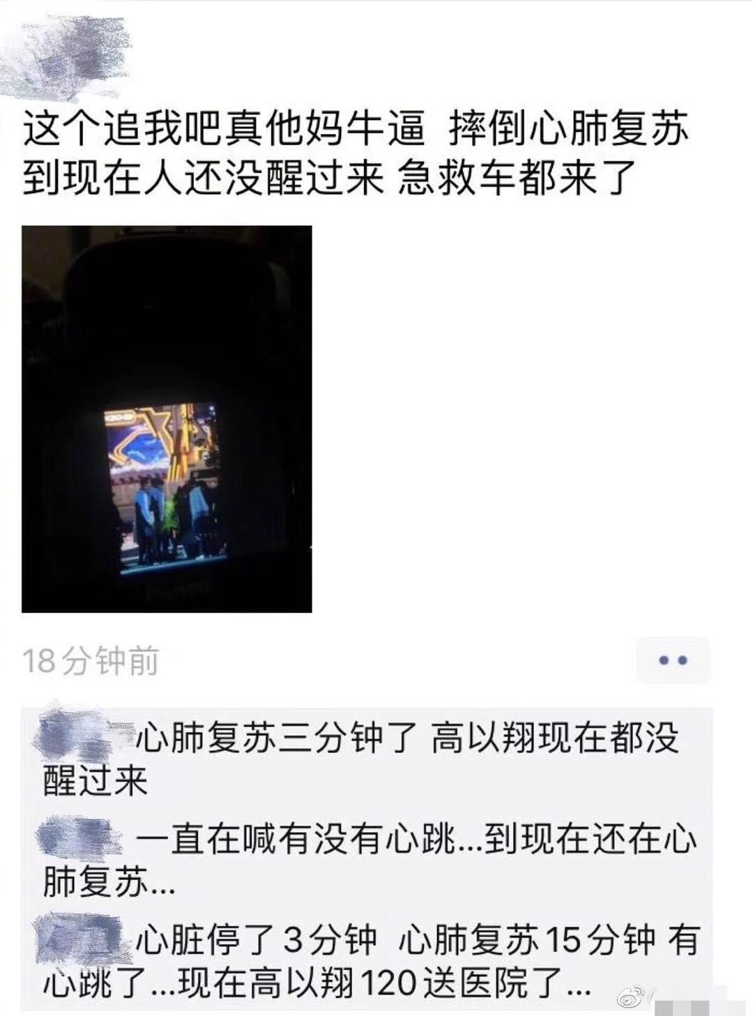 网友爆料影视演员兼模特的高以翔在录制综艺节目《追我吧》时晕倒,估计节目是深夜录制,高以翔被抢救十多分钟后送往医院进一步救治,而有博主称“人没了,猝死。”,媒体求证浙江卫视和高以翔方,没有得到回复。