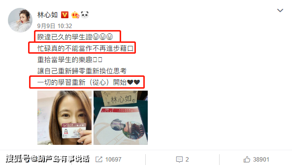 不仅如此,林心如还提到了自己在之前晒出的“学生证”,表示自己目前正在“世新大学”读研究生。不过林心如同时也透露,自己是在“世新大学”上海分校学习,而不是在台北。所以,平日里星期五到星期日三天都要飞往上海学习。
