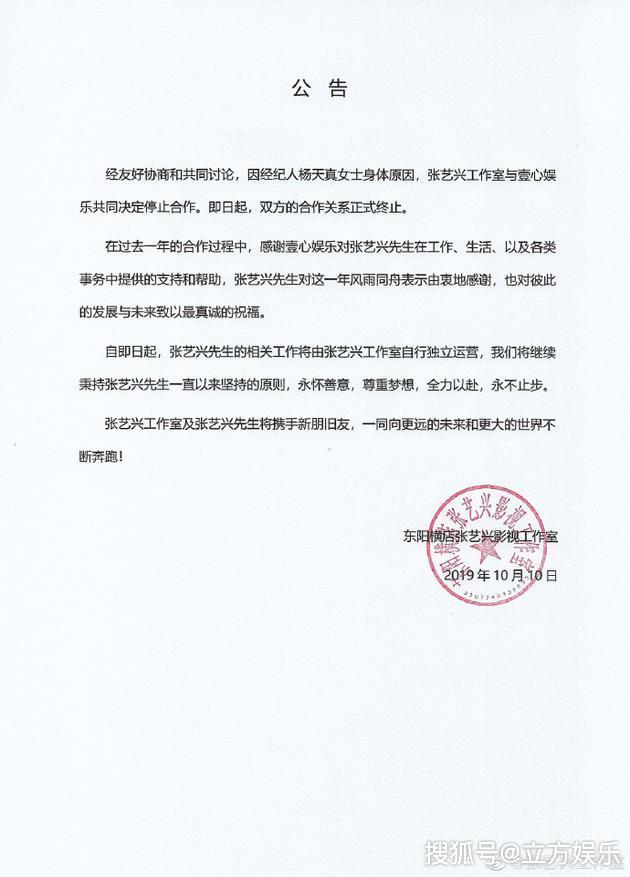 10月10日晚间,张艺兴发布公告,称经过与杨天真友好协商后,张艺兴将成立工作室独立出去,与壹心娱乐就此分开。杨天真在回复中说道,因为张艺兴太过忙碌,而自己作为他的经纪人近两年身体出了很大问题,所以需要休息一段时间。