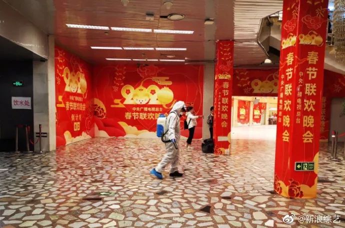 参与彩排的演员们都带起了口罩防护,工作人员为春晚场地一遍又一遍的进行消毒;