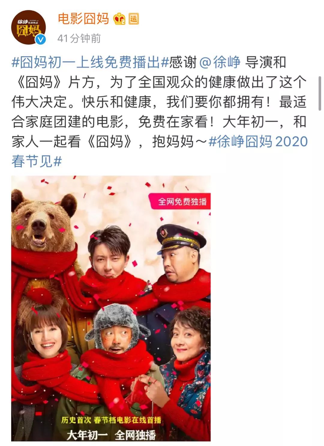 电影《囧妈》还在今天官宣将于初一在网络平台上线免费播出,让大家在家也能收获这份快乐;