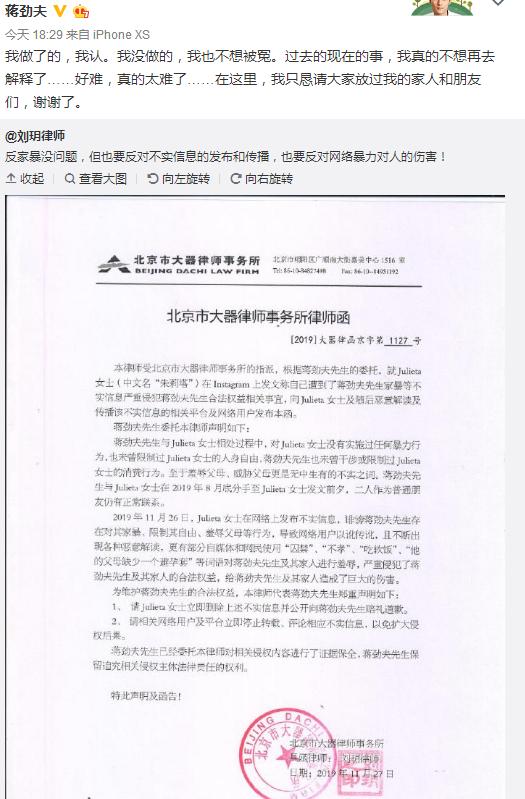 后来蒋劲夫果然在微博上承认了有过家暴行为,而且真诚道歉忏悔。但如此实锤之后,即使蒋劲夫悔过,但网友对于家暴零容忍,即使他们还没结婚,即使对方是日本女友,大家依然对其口诛笔伐,蒋劲夫人设彻底坍塌,不仅事业名声毁于一旦,一度还被收监,差点面临牢狱之灾,最终不知道花了多少钱和解,才能回国过新年和春节,重新获得自由。