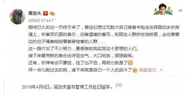 但是最近几年,蒋劲夫与老东家合约到期,事业也陷入瓶颈,相比其他有过类似与老东家解约经历的明星都另立炉灶或者签约新东家,蒋劲夫在这个转折点却没有这样做,而是在事业低迷时期,选择去日本留学充电。谁知道本来看似休闲充电的留学生活,却成为蒋劲夫事业甚至人生的转折点,留学时的恋情绯闻,不仅没帮助他在娱乐圈人气大增,反而让他从此与影视圈渐行渐远。