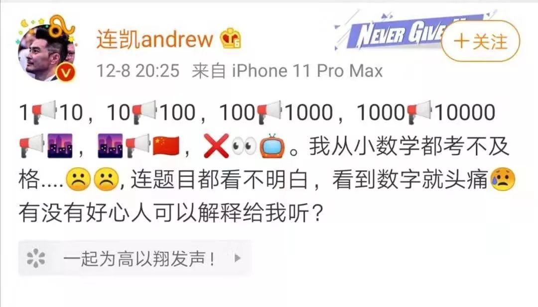 之前徐峥公开问责过节目组,连凯绝对是问责最刚的艺人,为了高以翔已经算是和浙江卫视撕破脸了。