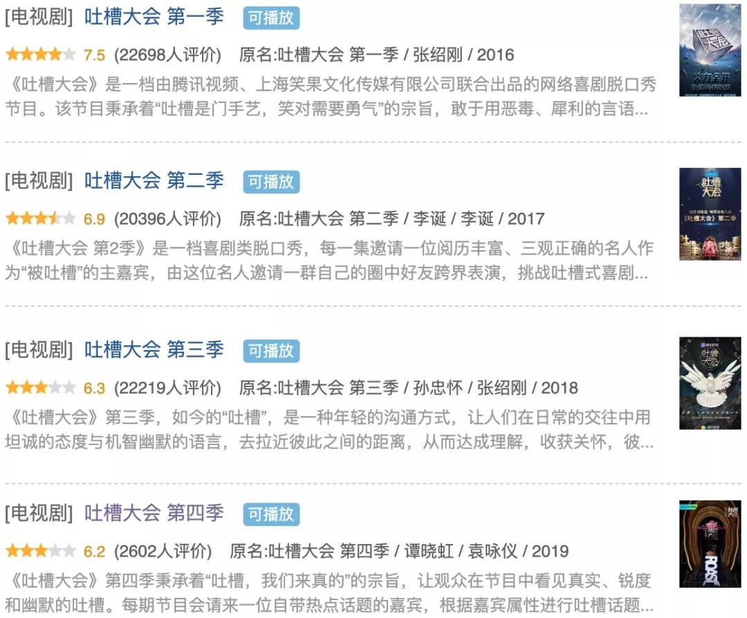 豆瓣7.5、6.9、6.3的前三季评分,到如今第四季的6.2,仅从这一维度看,《吐槽大会》仍维持着正常水平。但从第二季、第三季评分情况来看,曾经历过低开高走,也曾经历过直线下滑。