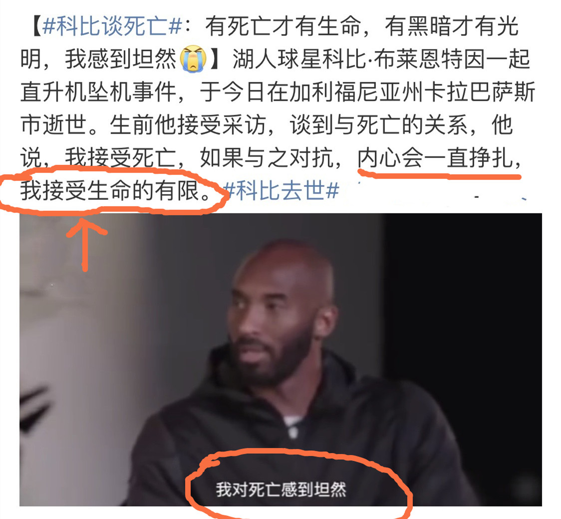 科比生前面对采访曾谈起关于死亡的感想,科比坦言,面对死亡很坦然,有死亡才有生命,有黑暗才有光明,内心会有挣扎,但是接受生命的有限。可以看出科比的心胸和豁达。科比的一生虽然短暂,但他的一生就是一个传奇。每个粉丝都会记住他,想念他!