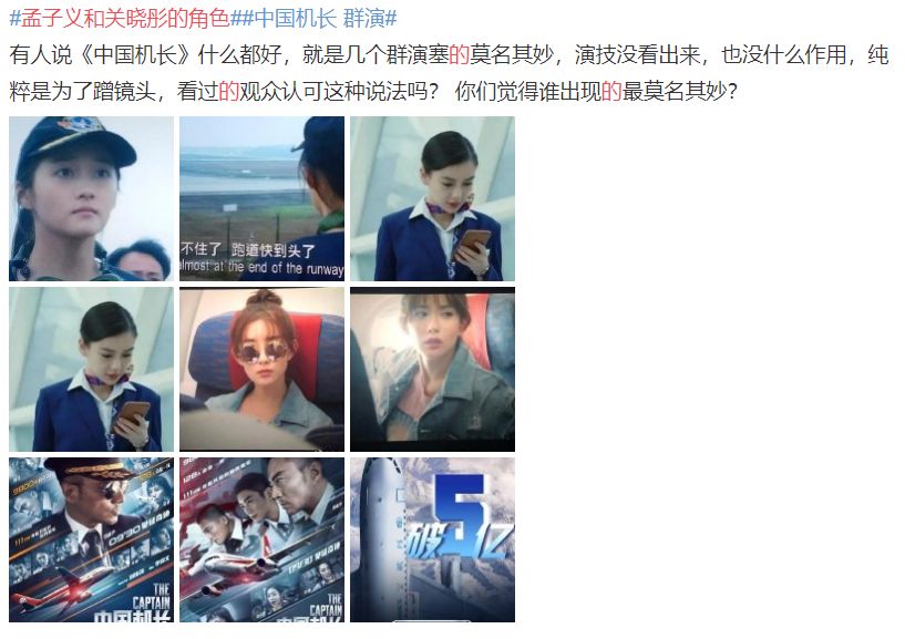 关晓彤的角色据说是因为一位航天爱好者录下了备降全过程,所以好歹还算有点意义,只是电影没说明白。如果说关晓彤的角色是为了还原真实度,大家还能勉强接受,但孟子义的角色就没那么好理解了,网友说她戏份太尬,多余的不能再多余了,还让杜江饰演的机长角色变成了撩妹渣男。又联想到之前拍《陈情令》时这位就是加戏咖,所以网友对孟子义的反感更甚,说她是败笔。角色给了镜头给了,如果还是扶不起来,真的是印证一句真理:强捧不红。